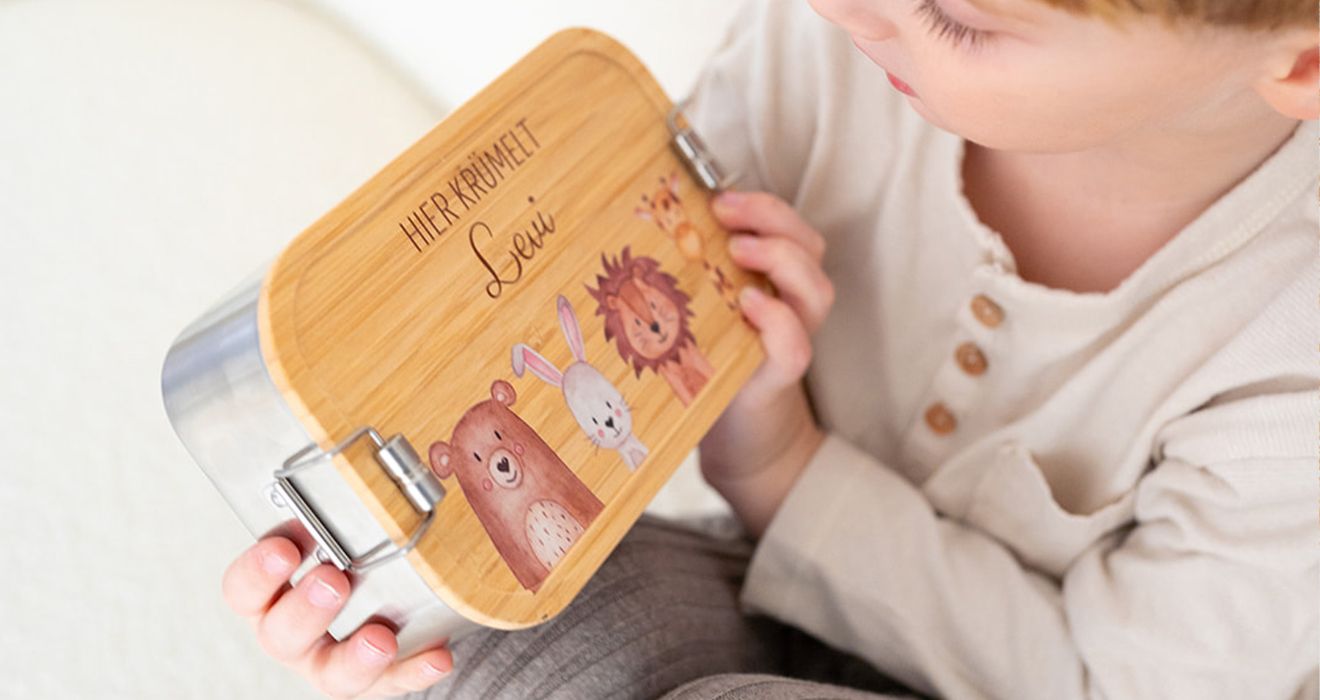 Ob eine personalisierte Lunchbox mit Lieblingsmotiv, eine robuste Trinkflasche mit Namen oder eine praktische Kindertasche – alle Produkte sind kindgerecht gestaltet, hochwertig verarbeitet und machen den Start in den neuen Lebensabschnitt noch ein bisschen schöner. Auch bunte Zeugnismappen, personalisierte Stifte und viele weitere Kleinigkeiten, die man am ersten Schultag eben so braucht, findest du in unserem Sortiment.