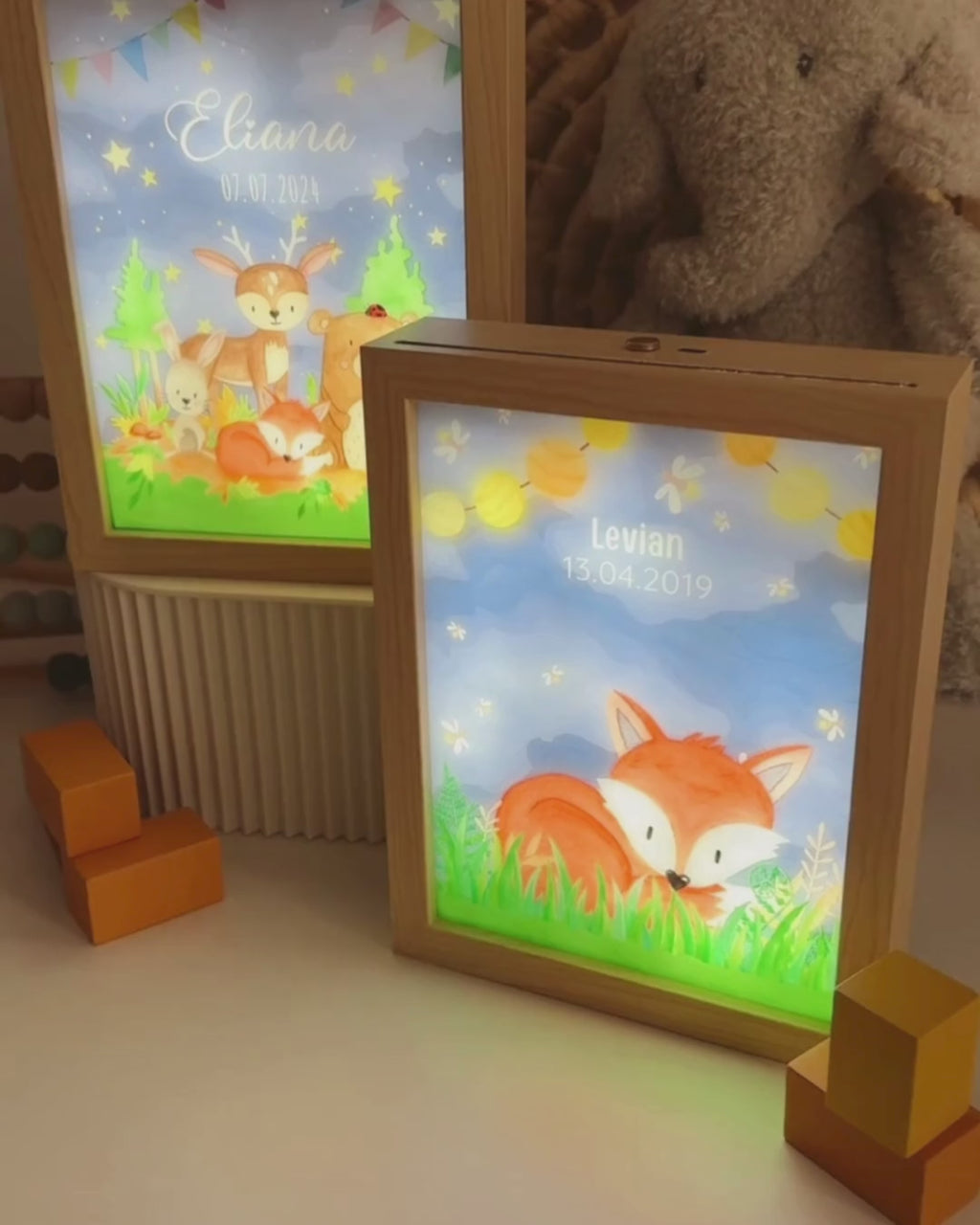 Unser personalisierter LED-Bilderrahmen verwandelt sich abends in ein leuchtendes Kunstwerk – mit funkelndem Sternenhimmel, Wunschname und Datum. Wähle zwischen Akku- oder Kabelversion für maximale Flexibilität und passe die Helligkeit mit 3 Farbtemperaturen an. CE-geprüft und sicher für Kinderzimmer.
