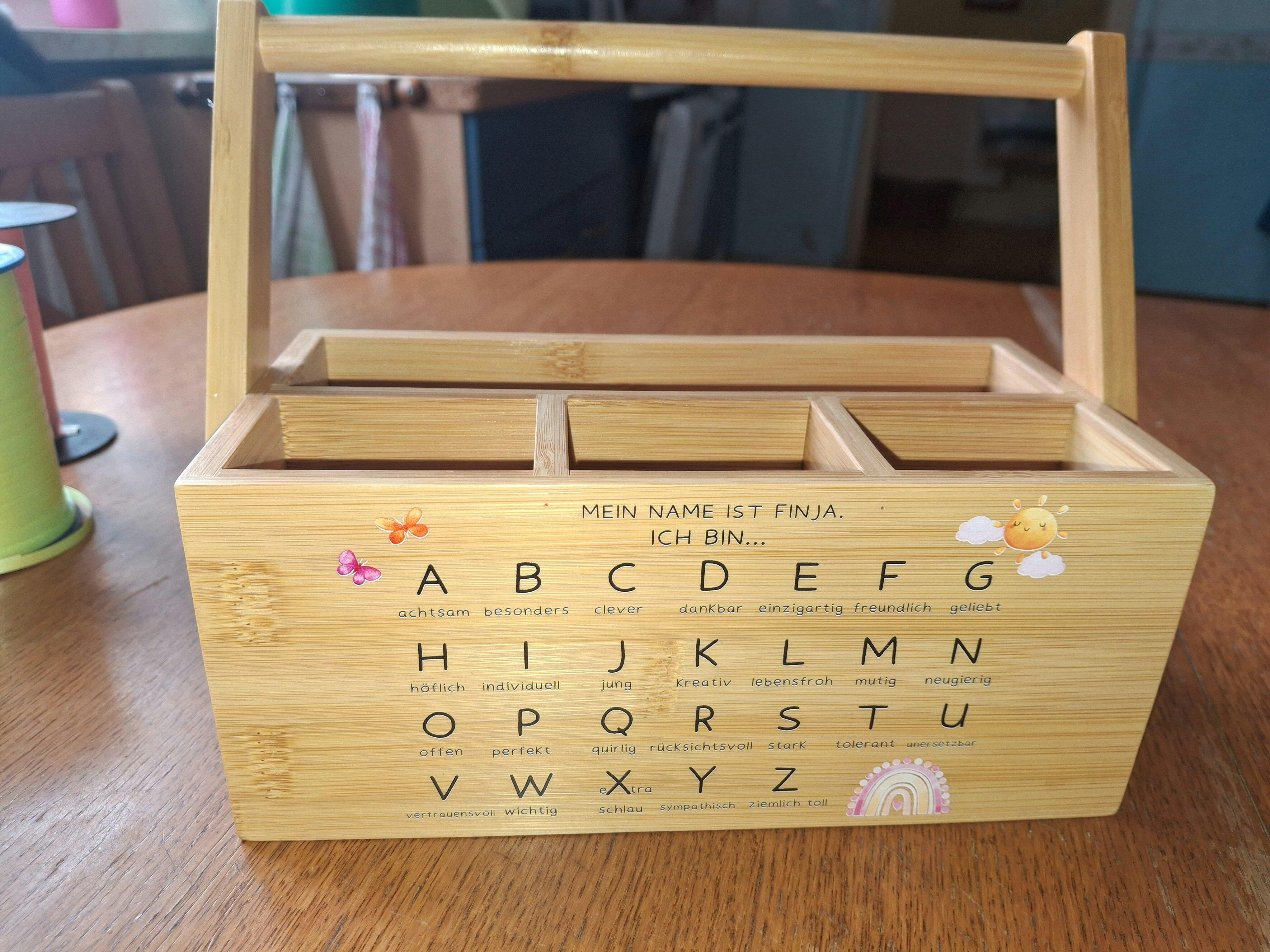 Entdecke den perfekten Begleiter für den Schulstart deines Kindes: Unser personalisierter Schreibtisch-Organizer aus Kieferholz sorgt mit liebevollen Motiven, Affirmationen und einem ABC nicht nur für Ordnung, sondern auch für ein Lächeln auf dem Gesicht deines Kindes. Schenke deinem kleinen Abenteurer ein praktisches und stilvolles Geschenk, das jeden Tag aufs Neue inspiriert! 🎨✏️
